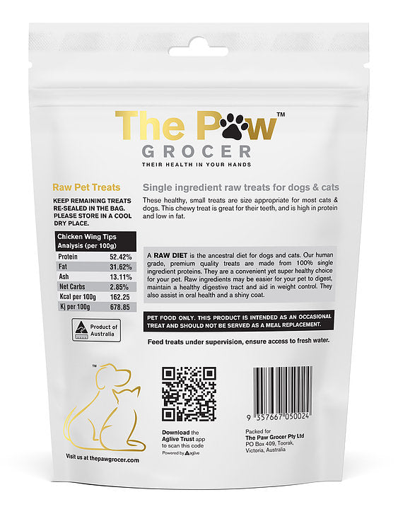 Light, crunchy and wildly satisfying to chew, our Chicken Wing Tips are a natural way to help keep teeth clean. High in protein and calcium, they support strong bones and dental health for both dogs and cats. Freeze-dried raw with no fillers or nasties—just supervise and let them crunch away.