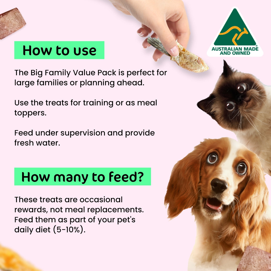 Got a house full of paws? This mega pack covers training, chewing, meal-topping and enrichment for dogs and cats. Wings, Necks, Salmon Bellies, Thighs, Lamb Hearts, Duck Liver, Duck Hearts, Kangaroo and Goat Offal offer variety, rotation and serious value—always 100% Aussie, single-ingredient and freeze-dried raw.