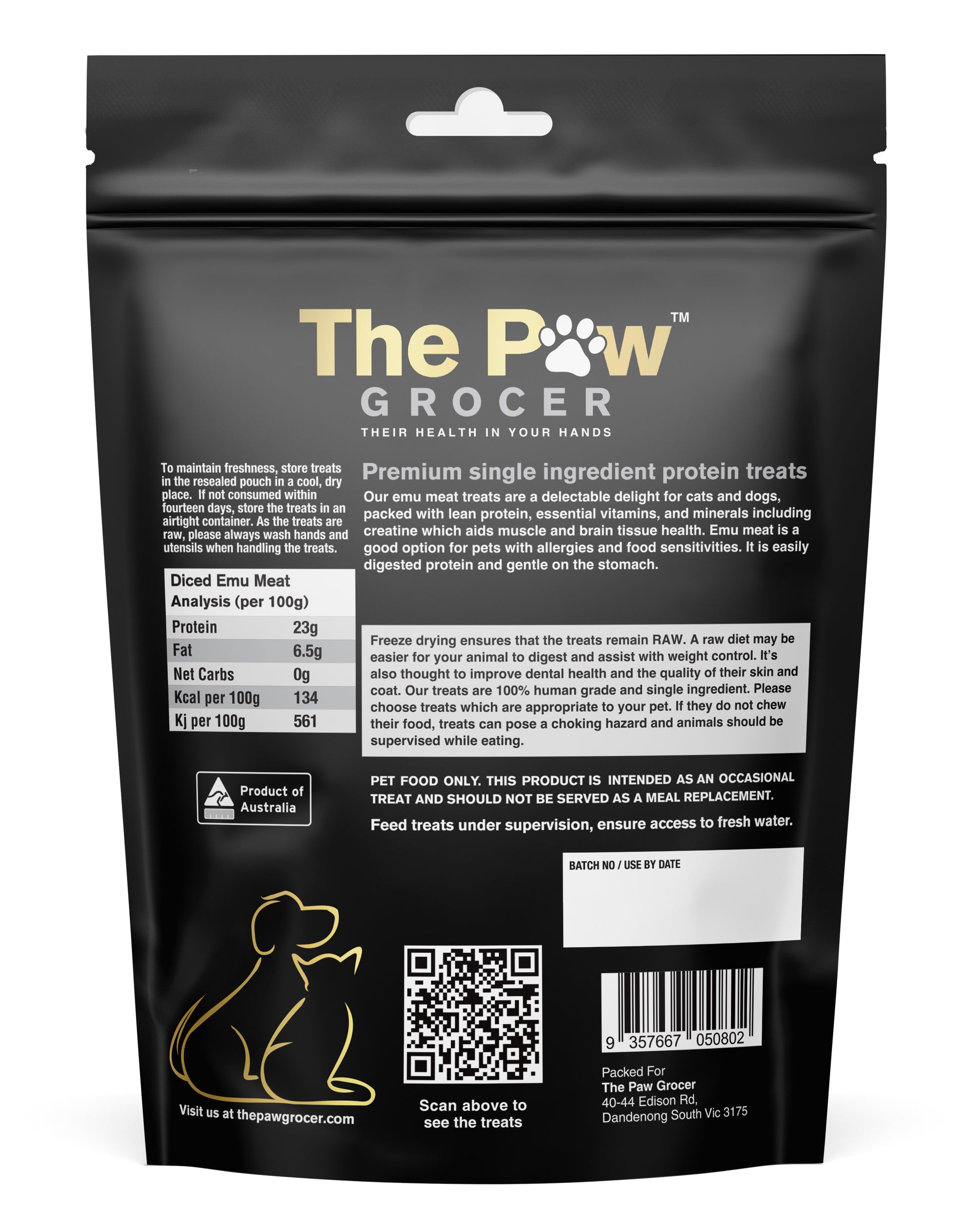 - Our emu meat treats are a healthy & nutritious option for dogs & cats.