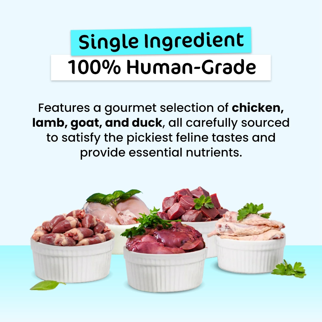 For the feline food critic. This bundle combines cat favourites—Chicken Thighs, Lamb Hearts, Wing Tips and Goat Offal—plus Duck Hearts from the Black Label range. All single-ingredient, Aussie and freeze-dried raw, it’s built to win over even the fussiest cats with variety, texture and serious flavour. Goodbye treat refusal.