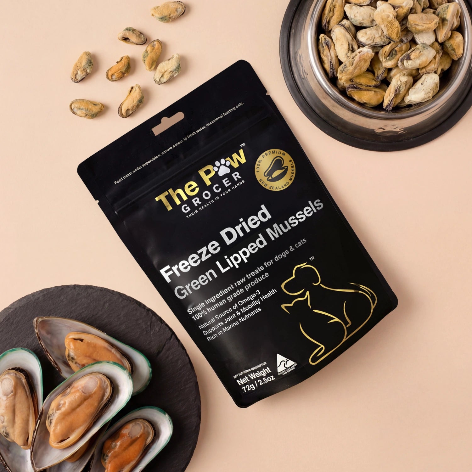 - New Zealand green lipped mussels are a marine-based, single-ingredient treat suitable for both dogs and cats.