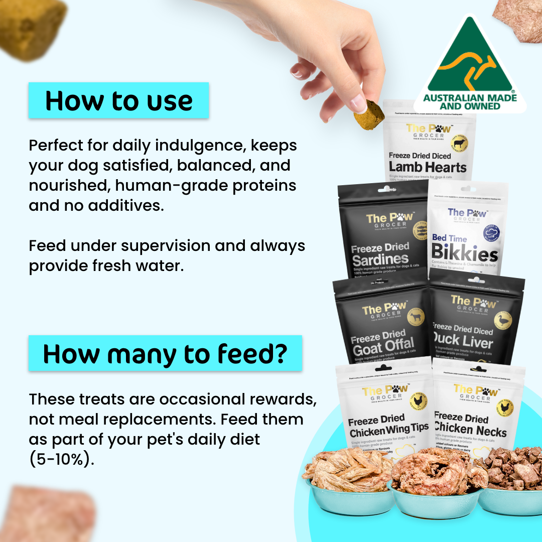 This all-round dog bundle fuels play, training and recovery. With Bedtime Bikkies, crunchy bones (wings, necks), nutrient-rich hearts, goat offal, duck liver and sardines, it supports joints, teeth, sleep, energy and overall health. 100% Aussie, human grade proteins with zero additives—perfect for dog parents who want a one-stop vitality kit.